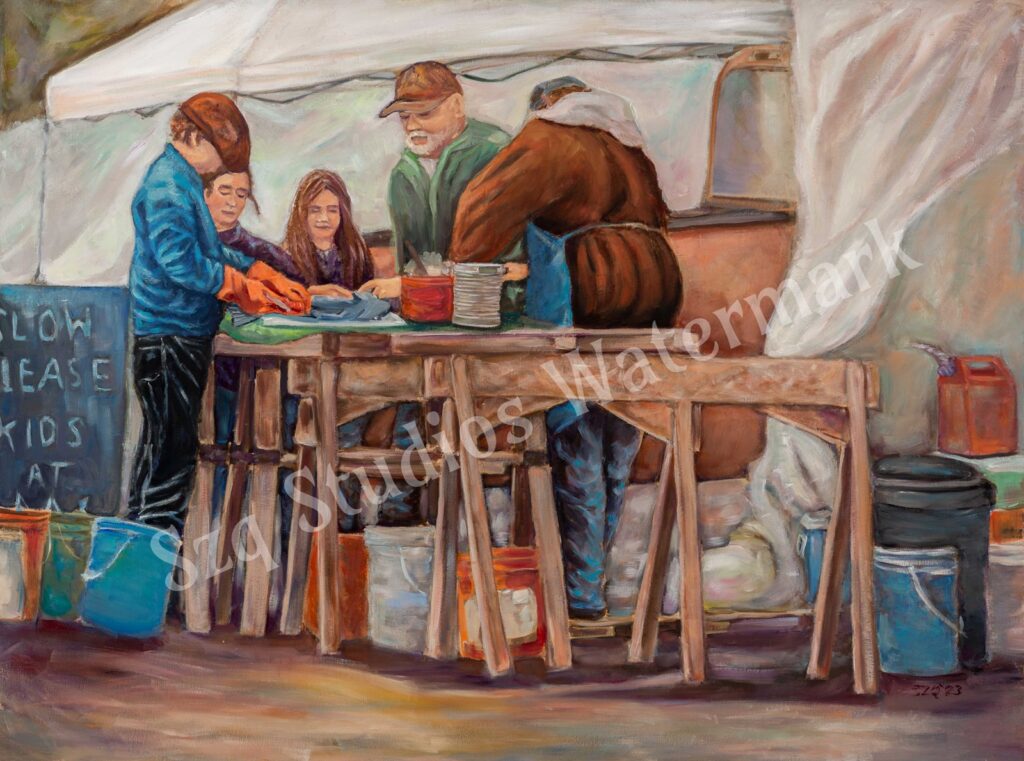 “Alaskan Children at Play” Oil on gallery canvas. 30 x 40 inches. I loved the beautiful family moment in this scene where they are processing the fish they caught. The chalk-board sign made me smile. I could imagine my own kids whining: “Dad- can we please go ride the quads?” and he replying “You know the rules: Only after we filet this 50lb of fish!” Only in Alaska!