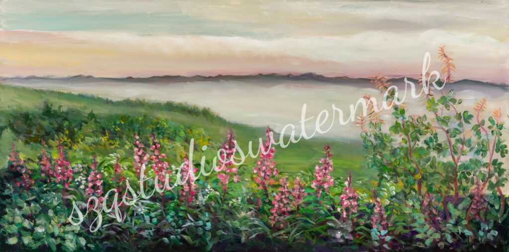 “Don’s Sunset” Shirleyville Alaska. Oil on 5/8 canvas 18 x 24 inches