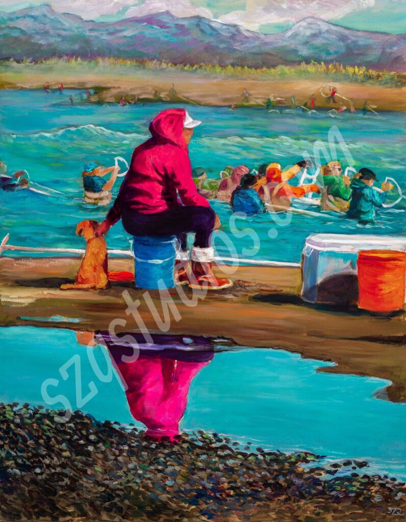 “A Moment of Reflection” Oil on Gallery Canvas. 22 x 28 inches. This scene depicts the hundreds of Alaskans that gather on the river beach to dip-net for salmon.