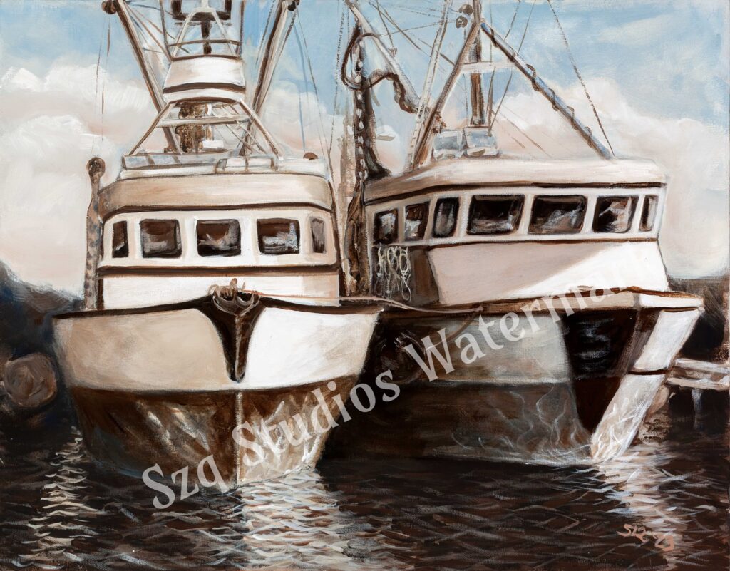 “Wishin’ I was Fishin'” Boats in Homer. 22 x 28 Acrylic on gallery canvas