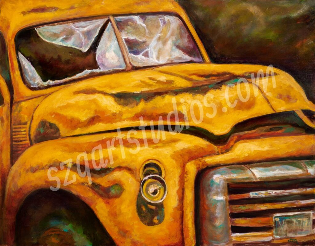 “Hope Springs Eternal” Seward Alaska. Oil on Gallery Canvas 22 x 28 inches. As Alaska is cut off from the Lower 48, people learned to keep everything. Appliances, scrap material and especially old cars. As Alaskans had to be self-reliant a junkyard of old materials could be scrapped and used again for something else. They became quite the up-cyclers. This old beauty was saved from scrapping, no doubt with the hope of restoring her- yet time and the elements eat at her each year.