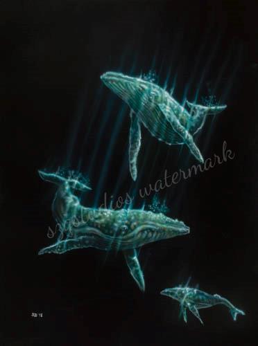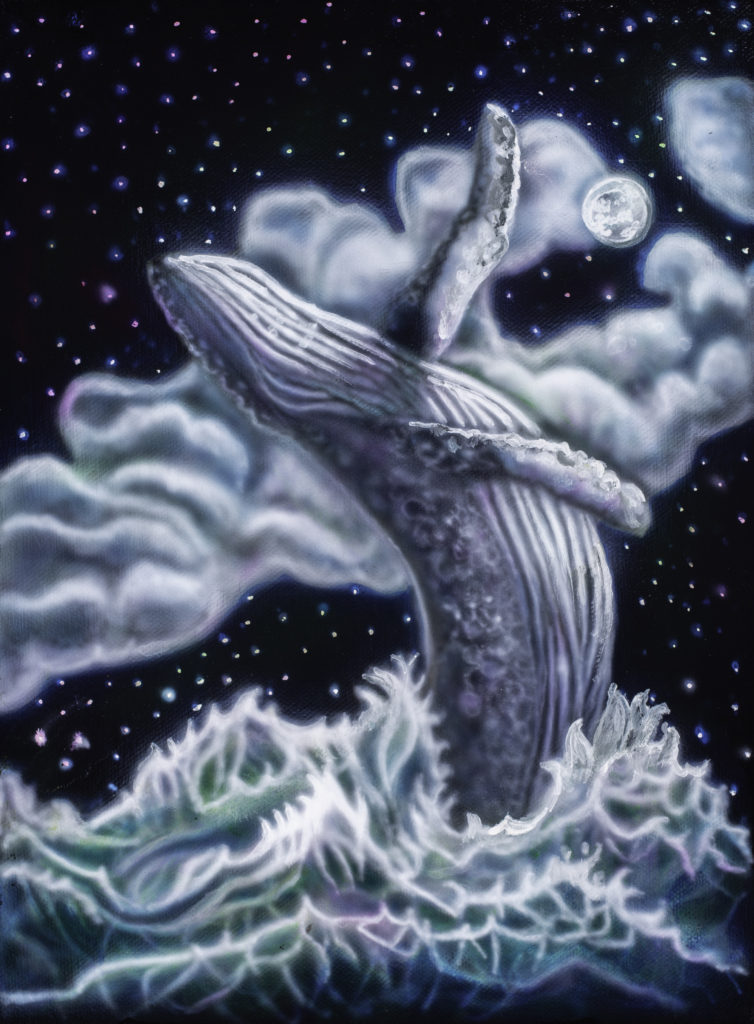 “Northern nights” Airbrush on black Mat board 30×40 This is one of those paintings that ends up “painting” me. I thought the painting was just about whales. But after completing it there was a message that kept trying to reach me, and it was this: In the storms of life, when the waves close over our heads, even in the darkness-and especially in the darkness- God is there waiting for us. Just as we can’t begin to fathom the underworld mystery of whales,- there are untold wonders that can only be discovered in the darkness. And it is there, when the lights of our world have disappeared, that God will reveal the “Northern Lights” to guide us home.