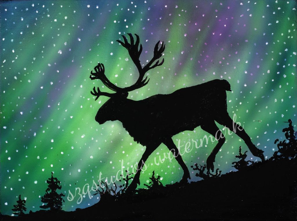“Caribou Lights” Airbrush acrylic on gallery canvas 9 x 12 inches