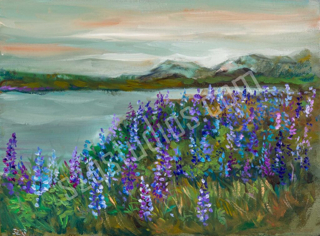 “Midnight Lupine” 16×20 airbrush on black Mat board. Lupine is an extremely hardy plant that grows in the summer here in Alaska.
