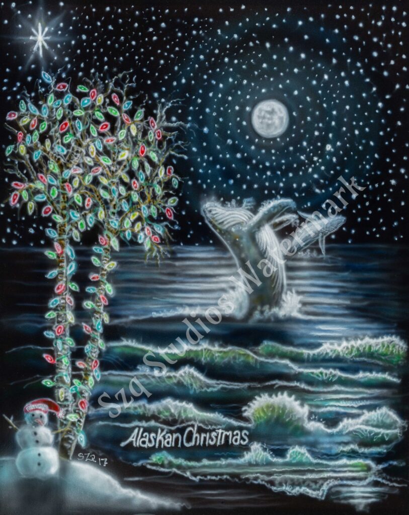 “Alaskan Christmas” airbrush on black matboard 16 x 20