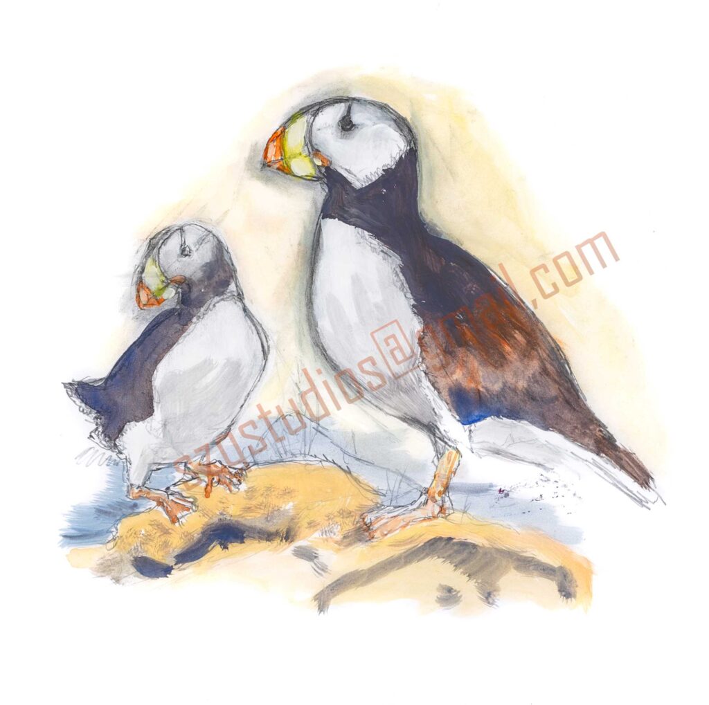 “Watercolor Puffins” Watercolor on bristol board 12×12 inches